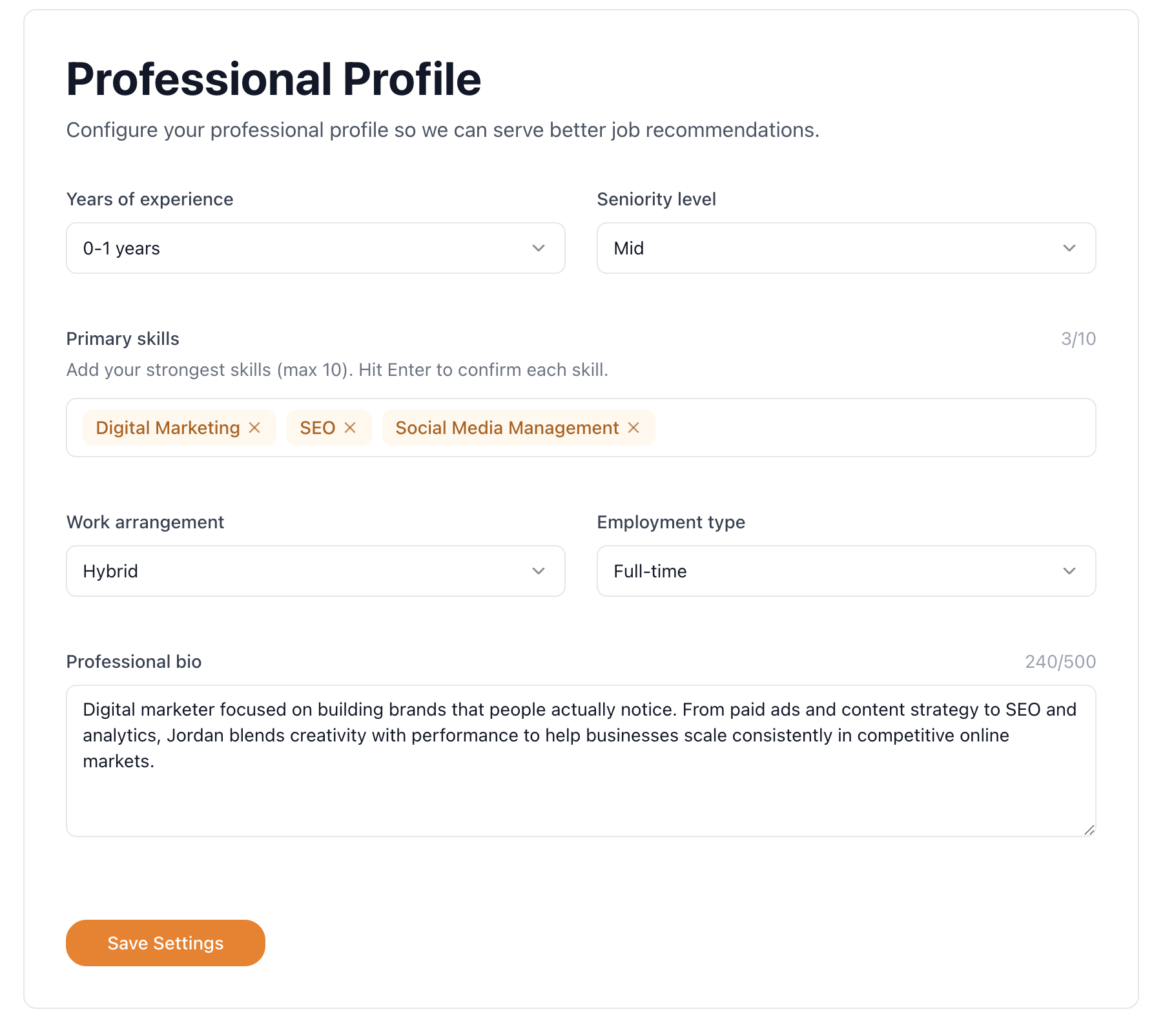 Experience. Education. Salary. Location. Work type. Preferences.